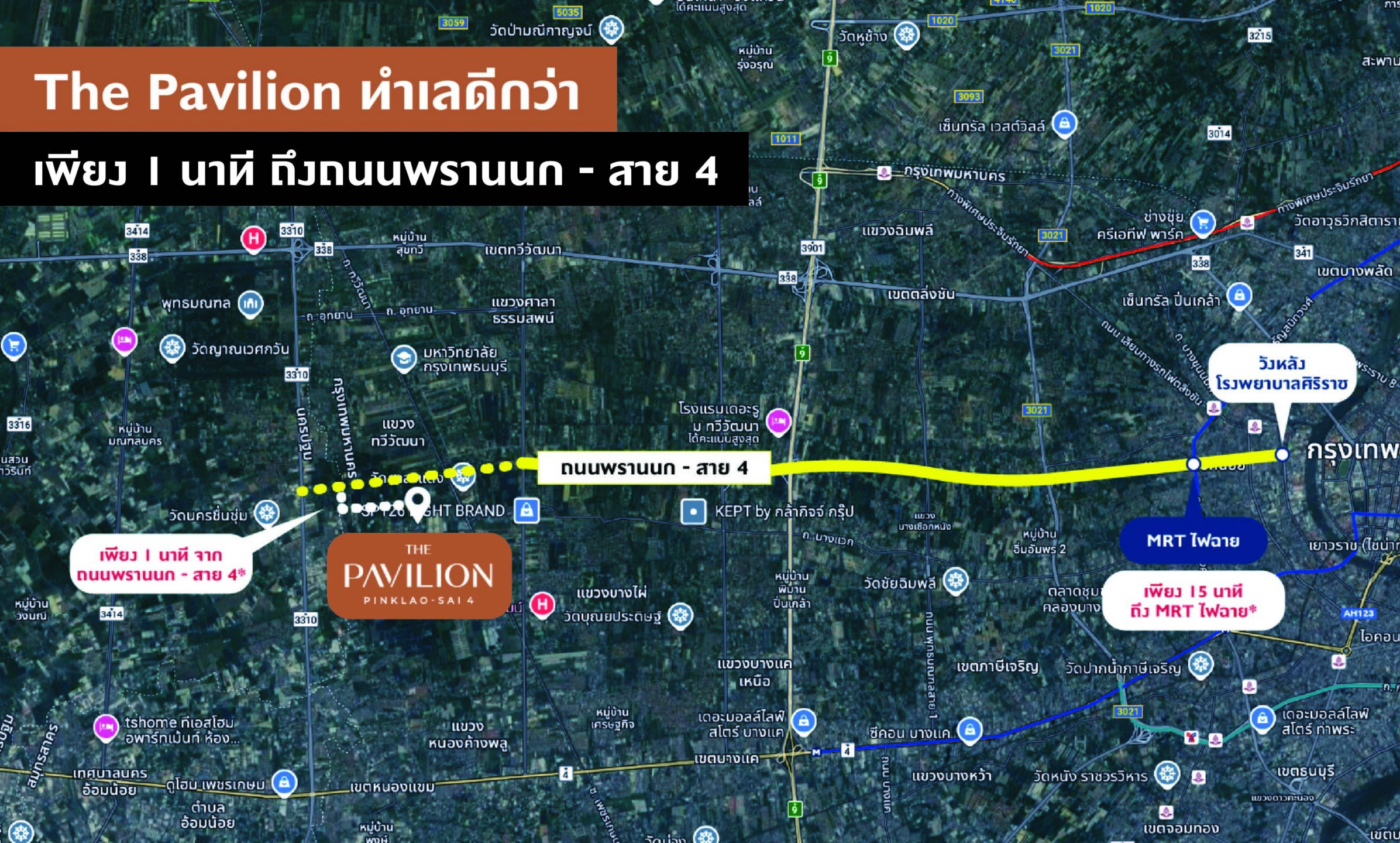 ซึ่งจากโครงการ เดอะ พาวิลเลียน ปิ่นเกล้า – พุทธมณฑล สาย 4 นั้นเมื่อเข้าสู่โครงการสามารถเชื่อมเข้าจากถนนพรานนก – สาย 4 ได้เพียงแค่ 1 นาที และเข้าสู่เมืองสามารถเข้าสู่เมืองได้โดยใช้เวลาเพียง 15 นาทีถึง MRT ไฟฉาย